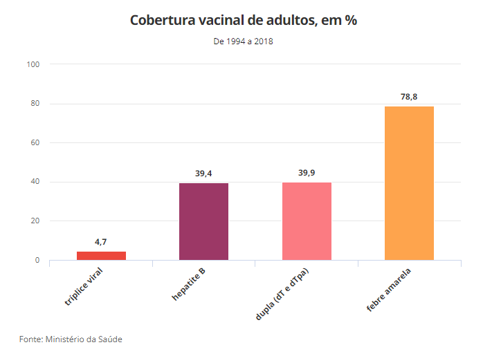 Segundo dados do ministério, das vacinas do calendário adulto a única que passa dos 50% de cobertura acumulada entre 1994 e 2018 é a da febre amarela com uma cobertura de 78,8%.